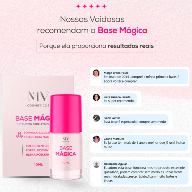 A Base Mágica é um tratamento para unhas naturais, possui fórmula concentrada e exclusiva, desenvolvida com os melhores ativos do mercado.